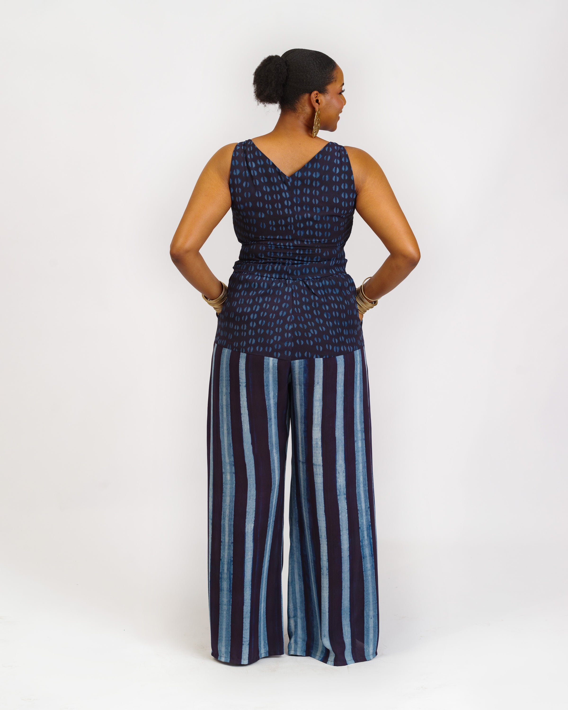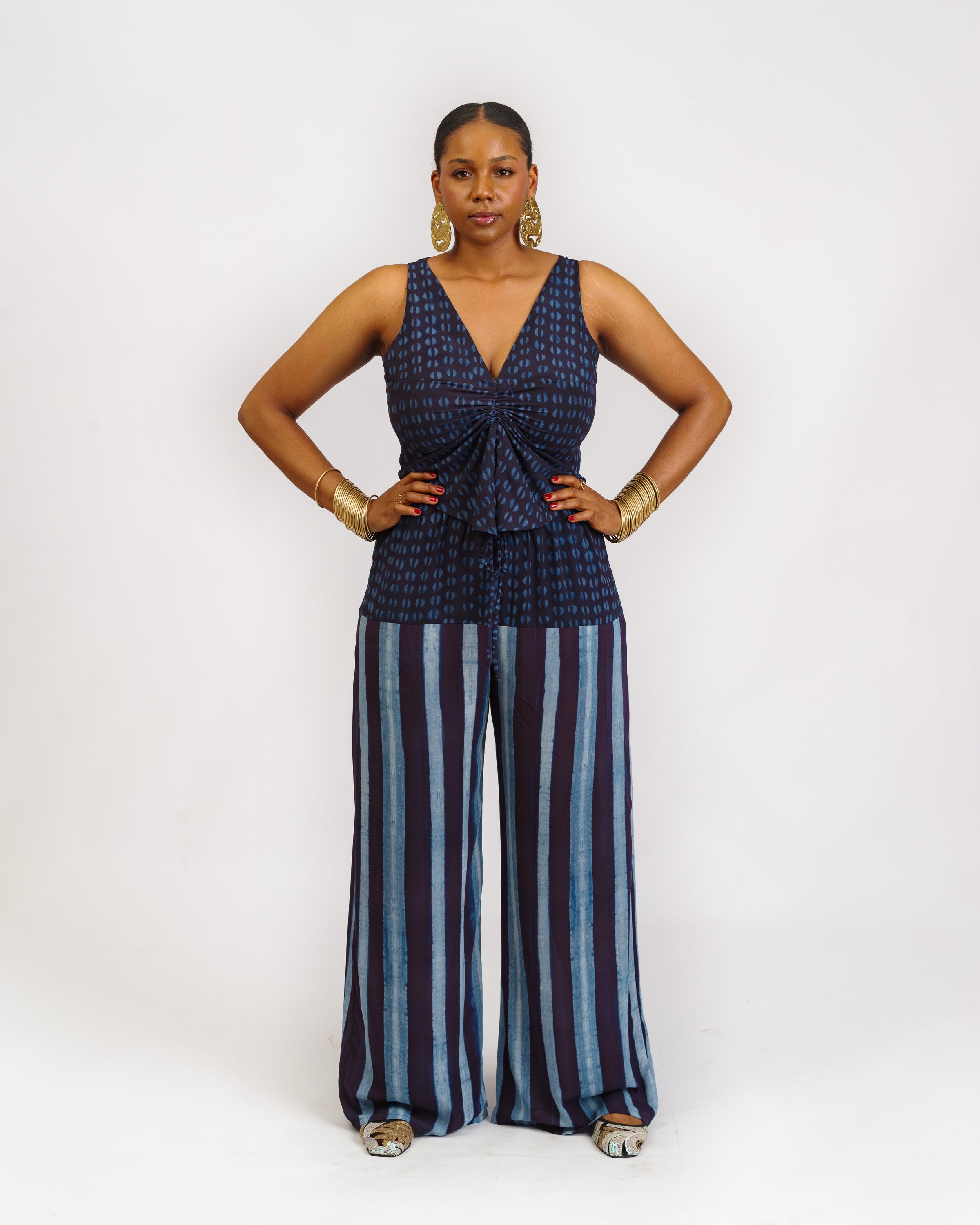 This set features a sleeveless top with an adjustable ruched front that enhances and celebrates your natural curves. Paired with wide-leg pants, the matching print between the top and upper pant section creates a seamless, elongating silhouette.